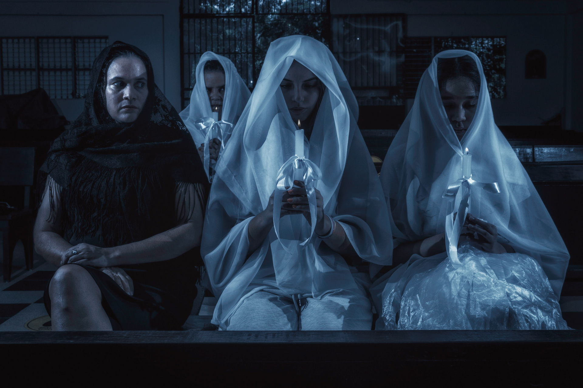 Luego se fijó en la enorme profusión de luces procedente de velas de cera, blancas como perlas, y adornadas de cintas muy blancas, que había ante el altar y la gran cantidad de muchachas vestidas de blanco impecable que se arrodillaban allá, cerca de la Sacristía “Habrá algún matrimonio”, pensó Juana Franco. “Pero no se ven los novios”. Miró con más cuidado en todas direcciones. La iglesia estaba completamente llena de gente, todos vestidos de blanco, algunos con túnicas del mismo color y portando todos en la mano izquierda un cirio prendido.